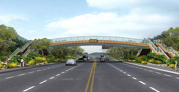 天橋位于旅游路千佛山南門入口與黃石崖路口之間,方便兩個景區之間的連接,天橋南北橫跨旅游路,天橋全長41米,寬4.5米,共1跨,上部結構為等截面鋼梁,橋梁全長為41米,梁高1.3米。天橋造型簡潔明了,曲線優美,自然的融入到千佛山景區中,與周圍景色渾然一體。工程造價700萬元,于2013年11月投入使用。